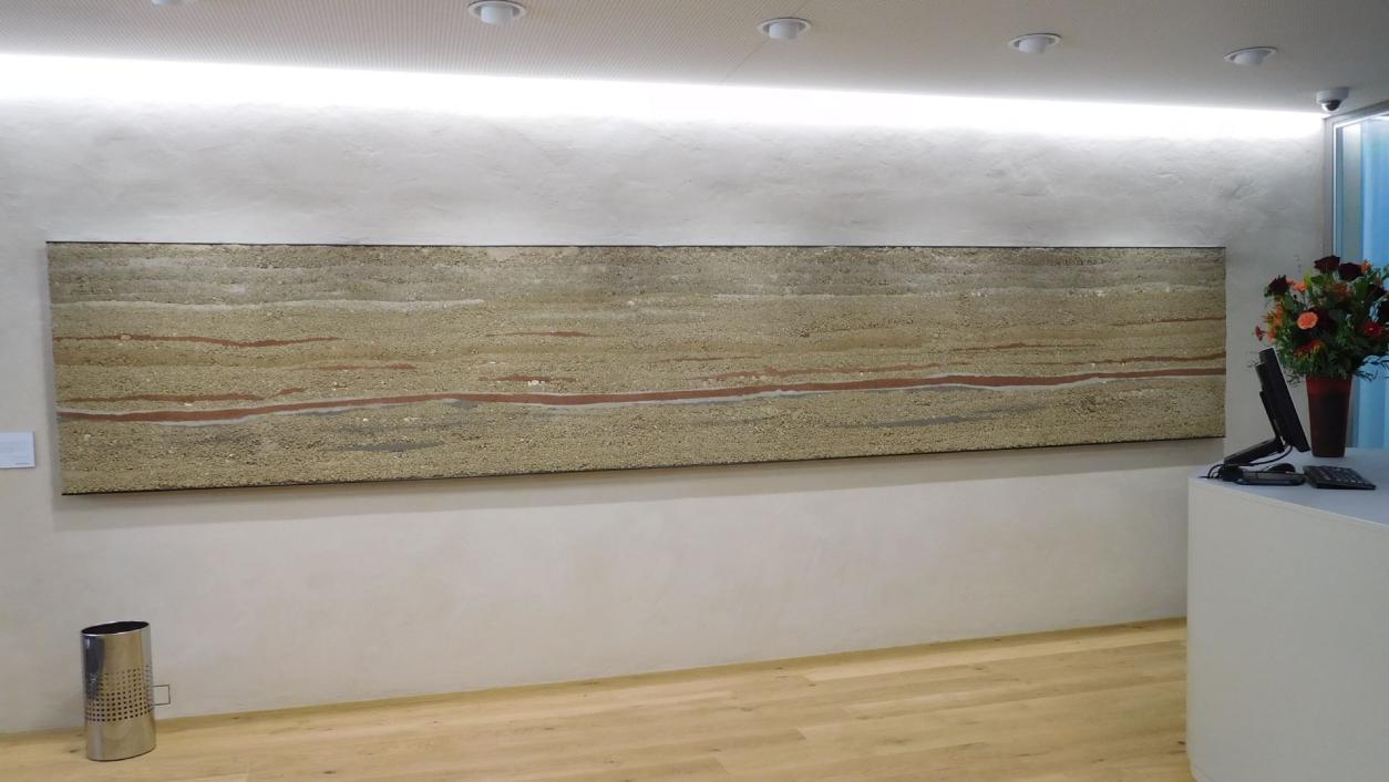Lage für Lage wurde verschiedenfarbiger Lehm vor Ort in eine Schalung gestampft, Intuition und das Vorbild der Umgebung als alleinige Berater. Das Ergebnis ist das einzigartige Zusammenspiel von rotem, gelbem, weissem und grauem Lehm.